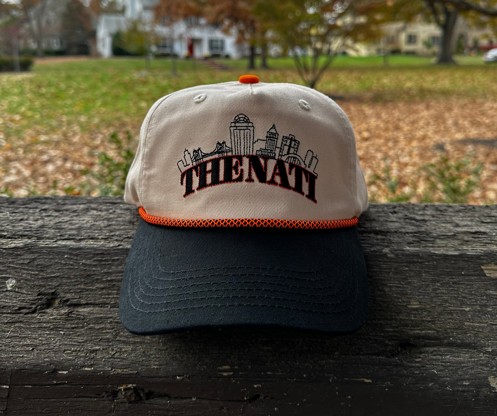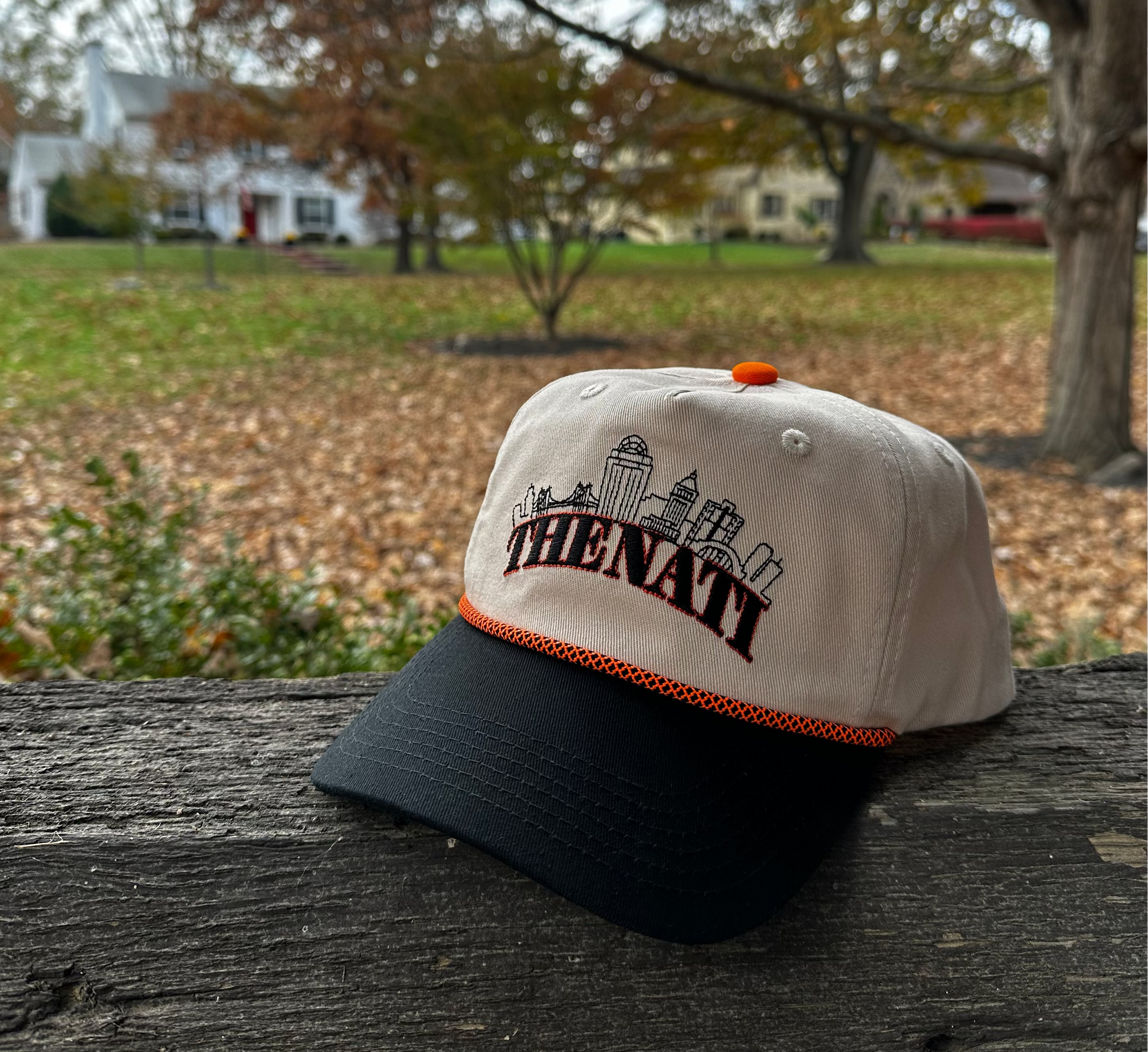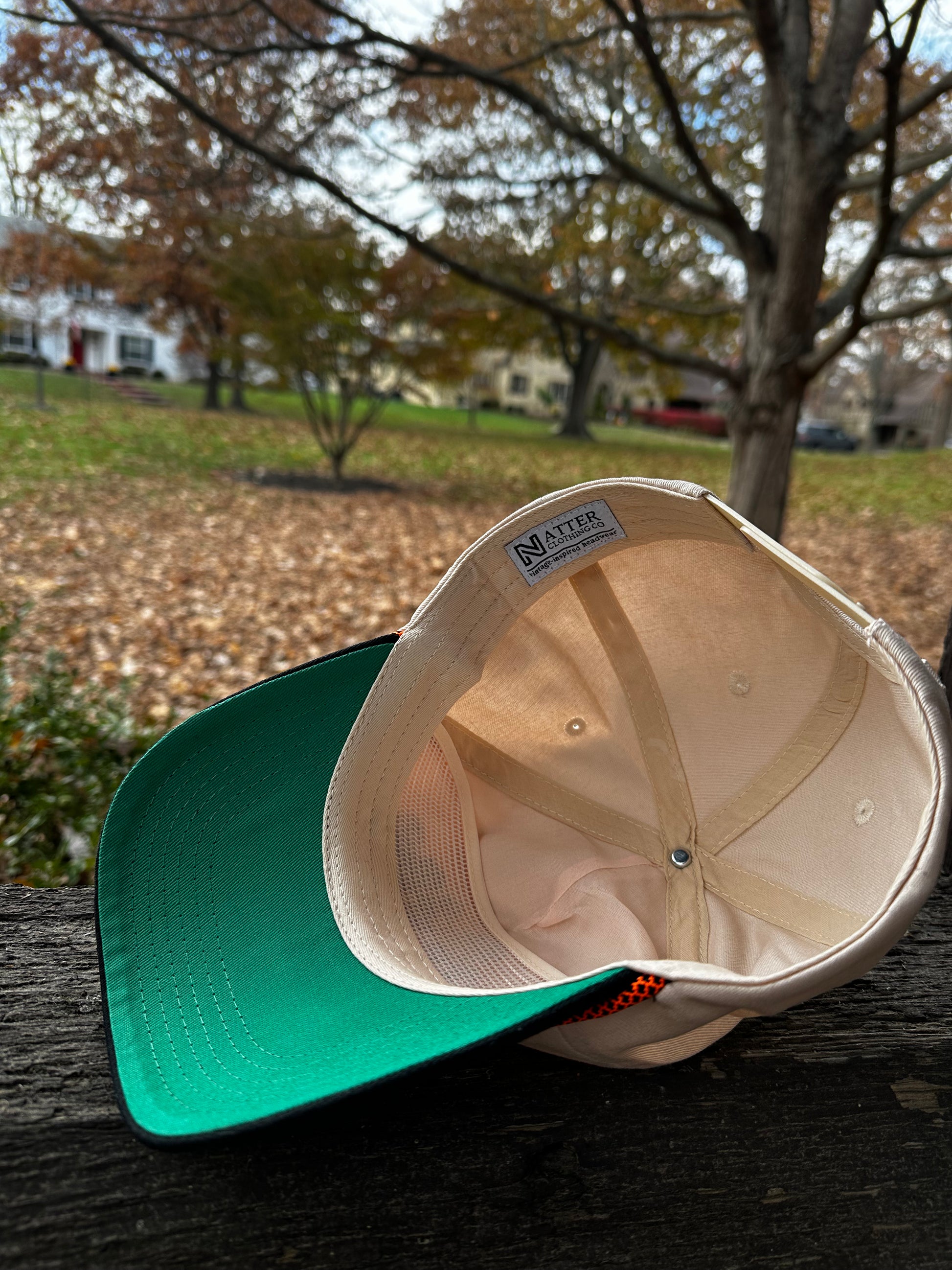 - Colors: Cream cap, black brim, orange rope.