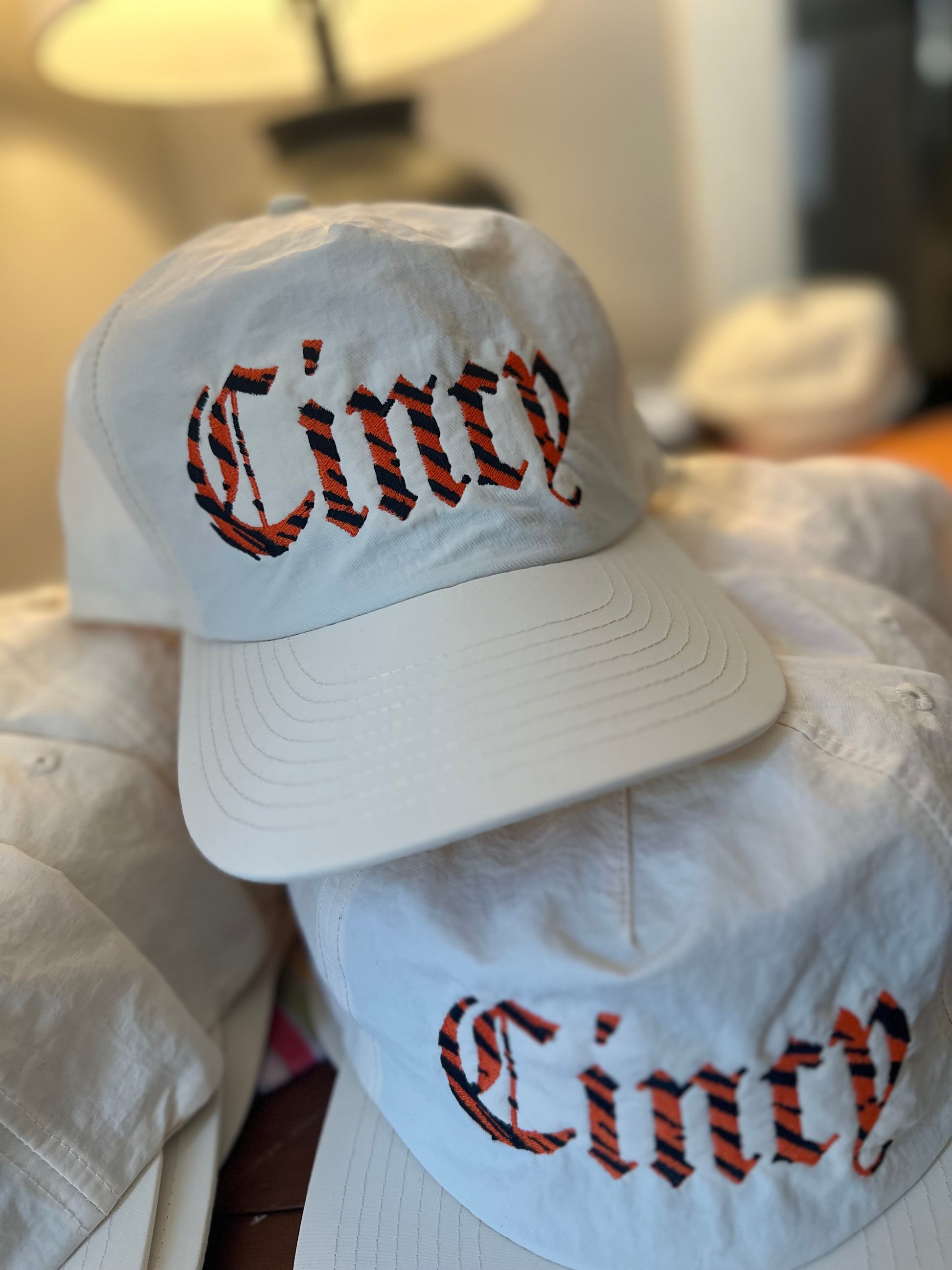 Each hat features an Old English, striped CINCY embroidery front and center, with an adjustable snapback closure for a custom fit and all-day comfort. Proudly made in collaboration with CinciMade Embroidery, this cap blends local pride with premium craftsmanship.